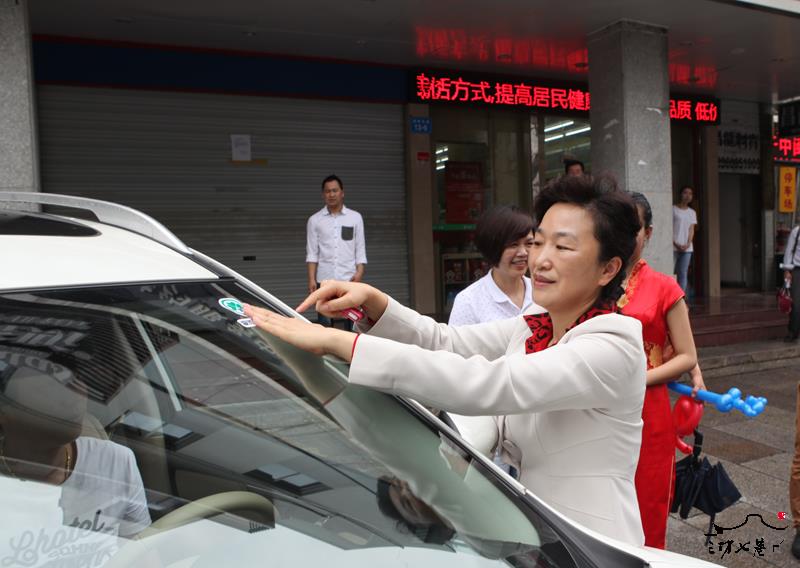 福建省旅游局局长亲自为参加:“爱旅游 行文明”贴车标活动的车辆贴上车标。