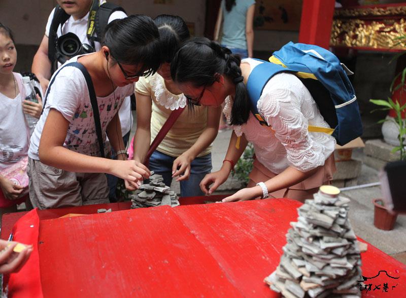 游客在三坊七巷天后宫内体验传统中秋节民俗文化活动“摆塔”