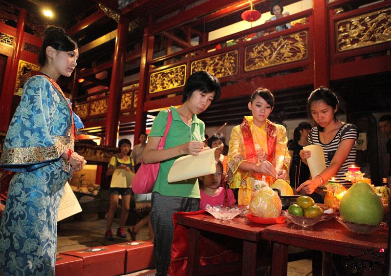 9月19日,三坊七巷郎官巷天后宫举行拜月仪式。当晚天后宫设香案,为前来拜月祈福的市民免费提供场地,现场还有专人担任赞礼、执事等,指导市民拜月的礼节。