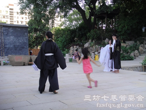 8月7日下午在三坊七巷光禄呤台,学生们在此进行COSPLAY节目的彩排。据悉,这些节目今后将在光禄呤台做为一个常态化的演出向游客展示。