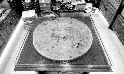 为营造中秋气氛,福州一传统糕点店制作了一个特大礼饼,摆在其位于南后街的门店里供市民参观。这个礼饼直径1米,重达183斤。据该糕饼店人员介绍,为制作这个礼饼,还特意定做了一个大型不锈钢托盘,使用隧道烤炉,由多名师傅同时制作,烘烤3个多小时方才出炉。