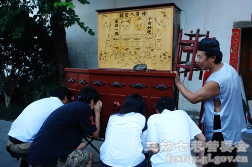 推片:观众坐在长条板凳上。将片放于木制箱中,分上中下三层,每层八张,每张片不过半尺。此种片需两人表演,一个推动底层的一张片子,顶动另一张供观众换看画片;一个在另一侧接过底层片子送入上层。旁边不花钱的观众只能看上层的片子,中层的看不到。演员表演时,也是把中层的片子说唱得神秘,夸赞得有趣,引人花钱。