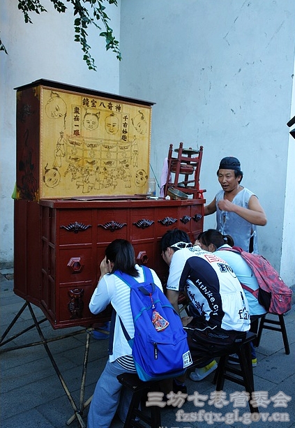 走在福州的南后街上,忽然听到一阵阵鼓罗的敲击声,看到前面围着很多人,挤进去一看,只见四五个人坐在长条凳上、弯腰通过小窗孔往木箱子里看,箱子上方写着五个大字:“神奇八宝镜”,这不就是所谓的西洋镜吗。前些时在杭州古街河坊街曾见过一次,装束基本一样,只是表演内容有所不同。表演者不停地拉着一边的换景绳,变换着箱子顶部的挡板改变光线,嘴里还用口技发出鸭子、鸟的叫声,并提示观看者看到了什么。几分钟的表演,观者个个称奇。