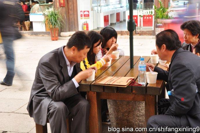 同利肉燕店前摆着休闲桌,本来是用来游客歇脚的,但现在变成了餐桌,一桌素不相识的人坐在一起吃肉燕,为了美食就将就一点吧。
