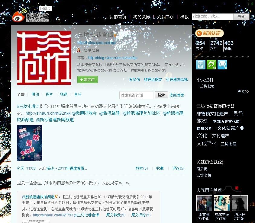 三坊七巷官方微博http://t.sina.com.cn/sfqx是福州文化单位试水网络、实现与市民文化互动一个比较成功的范例。