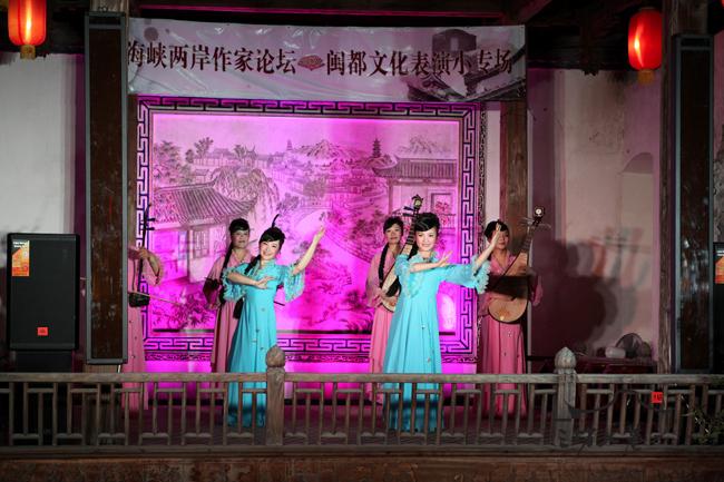 为丰富本次论坛内容,充分展示福州地方文化,28日晚,由三坊七巷管委会与省文联共同承办的地方艺术欣赏晚会在水榭戏台举行,晚会表演了福州的评话尺唱 、诗朗诵《与妻书》、《我的故乡》等精彩的节目,来自台湾的郑愁予、陈若曦、亮轩、吕正惠、龚鹏程和来自大陆的刘登翰、傅溪鹏、赵玫、项小米、阎晶明等知名作家、评论家观看了表演。