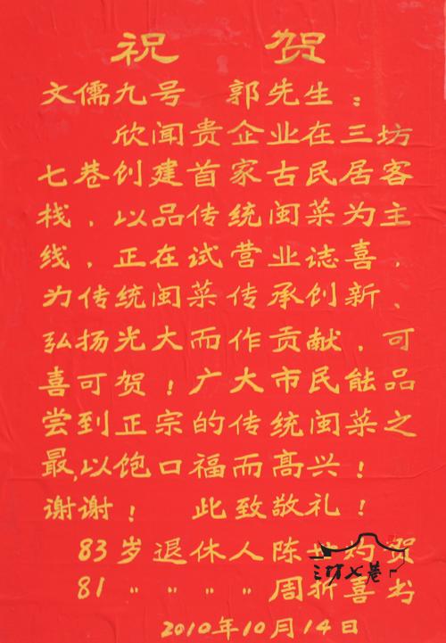 国庆假期,福州第一家古民居客栈“文儒九号”在三坊七巷亮相,客栈位于文儒坊56号。客栈闹中取静,为传统福州古民居庭院,景观宁静精美,富有文化灵气。 开业仅半个多月,两位福州市民就送上祝贺信,他们表示文儒坊九号客栈不仅以传统闽菜为主线,并在传统上加以创新,为闽菜弘扬光大作出贡献,也为广大市民能品尝到正宗的传统闽菜之最,以饱口福而高兴。