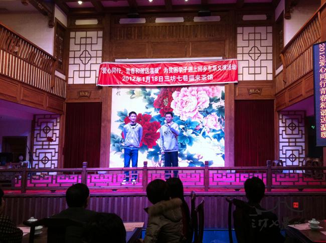 1月18日晚,由三坊七巷管委会、鼓楼区慈善总会、福州一中联合主办的“爱心同行—青春和谐送温暖”为贫困学子送上回乡车票义演活动在南后街福来茶馆举行。义演中,福州一中的同学表演了诗朗诵《春》、快板《情满人间》等精彩的节目,为经济困难学生筹集善款,助他们顺利返乡,让贫困大学生感受到社会各界的关怀和温暖。