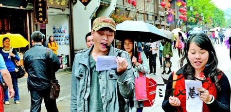 昨日,春雨潇潇,为古色古香的三坊七巷增添了几分诗意与空灵。“福州往事是一架尚未调试好的琴,被反复谈起,说不完的三坊七巷、悠悠马江,寿山石千古传颂、温润如玉……”突然,熙熙攘攘的人群中传来了诗歌朗诵声,这边朗诵声初歇,那边人群中又突然传来了戴望舒的《雨巷》朗诵声:“撑着油纸伞,独自彷徨在悠长悠长又寂寥的雨巷……”——由市文联主办、市作协承办的“诗歌快闪”活动首现榕城。“诗歌快闪”是新兴的诗歌行为艺术,通过互联网或手机联系一群人,在特定时间、地点聚集后,突然开始短暂的诗歌朗诵。