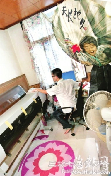 记者看到了不少已经做好的成品,其中一把油纸伞上印着一对青年男女的头像。他们说,这是婚庆公司定做的,自己购置了喷绘机,想搞点创新。