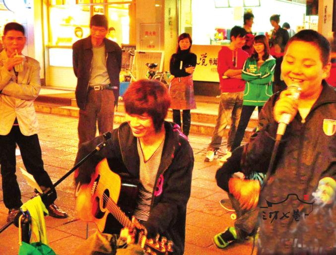 话说远了,再回到三坊七巷来,说说那眼镜小胖(图右)。小胖叫小浩,三十二中念初一,家在塔头,周末做完功课,自己坐公交来南后街,参加这里的“街头演唱会”,小浩把这当作是他周末最隆重的活动。“开始是听小飞哥的弹唱,后来他说有谁愿意唱的,帮他助助场,我就上了。每次出门我都下载好晚上要唱的歌词。《倒带》(蔡依林)是我在南后街上的‘成名歌’。”