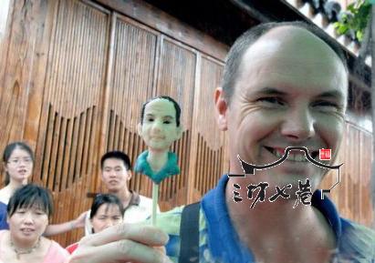 6日上午,南后街“现场捏面人”小摊吸引众多游客驻足。民间老艺人赵修诚忙得连喝口水的时间都没有,他的面人摊是南后街最红火的小摊之一。记者挤进层层“包围圈”,看见老赵正在为一个来自澳大利亚的小伙子捏面人像。他观察了小伙子的外貌后拿起工具,捏、挑、拨,不到10分钟,一个与他神似的面人就完工了。