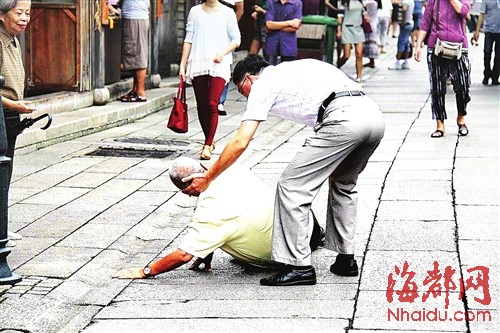 10月1日上午,福州南后街游人如织。突然,一名老依伯摔倒在石板路上。一名中年汉子看见了,毫不犹豫地弯腰去扶。旁边一名老依姆也喊着:“快扶他一把!”