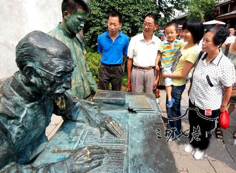 在南后街,刻书、当铺、裱褙、花灯等丰富的福州历史文化,用雕塑的形式展现。昨天,来自闽江学院的几名大学生装扮成“真人铜像”,与真铜像雕塑站在一起,吸引了不少游客与他们合影留念。伍松涛一家也兴致勃勃地与他们合影、攀谈,了解福州近现代历史文化风情。