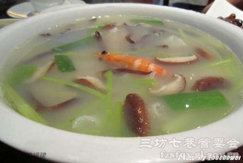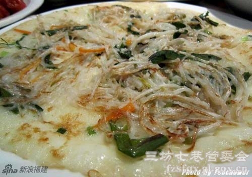 锅边糊,福州人叫“鼎边糊”,因为福州古老的方言里仍把锅称为“鼎”。用料很地道:海蛎、熟鱼干、蚴囝(蚬子)、虾米、芹菜,另外店里加了香菇、虾...我们吃完后又要了一份。