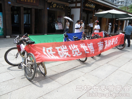 为了宣传节能环保、低碳生活,厦门大学南强骑行队于2010年7月27日由厦门出发,骑行前往上海。今天下午13:30——15:00厦门大学南强骑行队到达三坊七巷并在南后街进行环保宣传与文化宣传。
