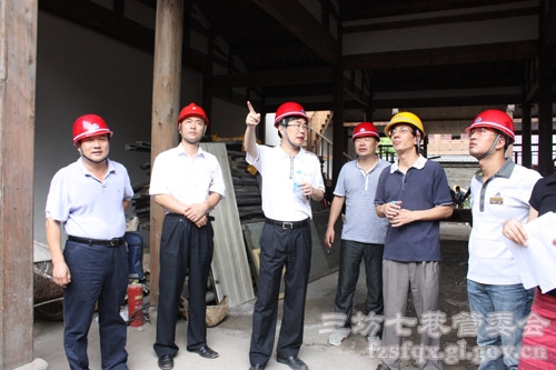 8月21日上午,三坊七巷管委会主任林飞、副主任叶子文带领管委会工程部、文物部,施工队有关人员检查建设工地。 在建设工地,林飞主任详细了解了施工安排和工程进展以及目前面临的难题。要求施工单位要全力以赴,真抓实干,一定要把工程进度抓紧,质量抓好。