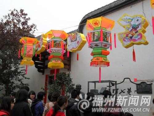 50多盏福州传统手工花灯,挂在南后街风雨廊上。这些花灯高约1米,围着其中一个转上一圈,便可发现,五六只模样机灵的小兔子,就呆在灯罩上,仿佛若是惊动,就要跳到别处去了。