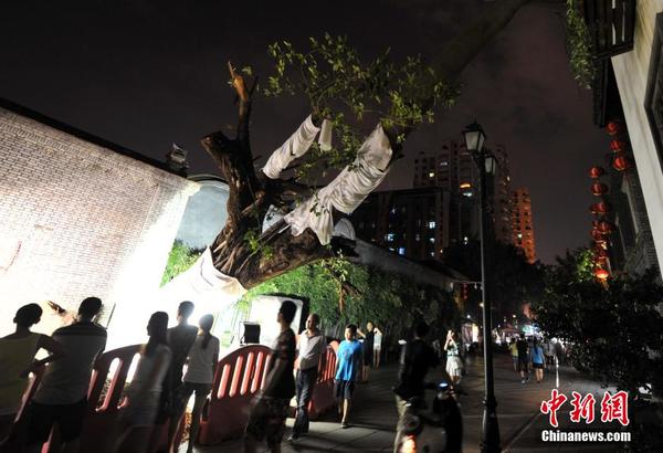 8月12晚,工作人员正在进行原地重植前的修理工作。位于福州三坊七巷南后街南向入口处,有一株10多米高的南洋楹树,树干挺拔。在其树干上还伴生了一株水榕树,南洋楹树和水榕树相依相伴了上百年,是三坊七巷标志性风景之一,被人们称为“夫妻树”,外地游客来三坊七巷游览,总不忘在“夫妻树”前留影。此次“苏迪罗”台风肆虐榕城,“夫妻树”在狂风中双双倒下。许多市民为此惋惜,不少市民希望能够在原地看到“夫妻树”。在“苏迪罗”离开福建后,园林局工作人员立马对“夫妻树”进行了进一步保护,保留其主要枝干并对根系进行了保护,同时给它打了两袋营养液,进行重植原地,待它伤势康复,市民依然可在三坊七巷欣赏到南门标志性风景“夫妻树”的英姿。
