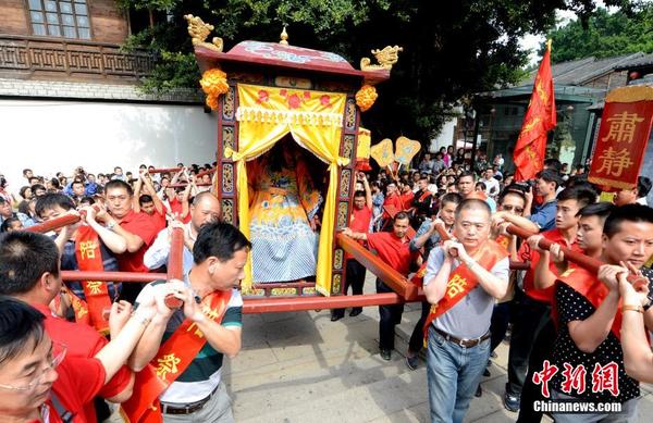 10月28日,来自山西运城关公故里始塑于明代的关公神像首次驾临千年古城福建福州,拉开闽晋关公文化艺术周活动序幕。当日,山西运城各界人士百余人护送着这尊关公神像到达福州三坊七巷。随后,来自海峡两岸及福州各界人士为关公神像举办了简短而隆重的欢迎仪式,仪式采用最传统最古朴的三献礼仪,以献花、献果、献茶的仪式,迎接关圣帝君驾临福州;在福州地区富有地方特色非物质文化遗产太平鼓、十二婆姐等表演队伍的引导下,关公神像驻驾于历史悠久的郎官巷天后宫内,并在此接受众多市民及游客的祈福。刘可耕 摄