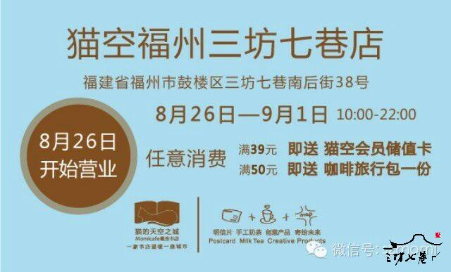 2014年8月26日,猫的天空之城概念书店福州三坊七巷店,正式开业!这个八月,猫空来到千年闽都福州,在三坊七巷开启我们新的旅程!猫空期待在这里,能与越来越多的朋友们一起创造出更加美妙的相遇!