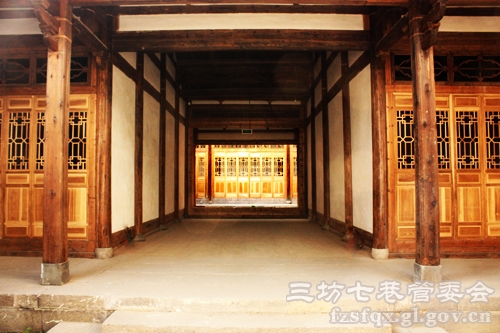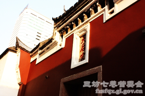 天后宫:位于福州市鼓楼区南街街道郎官巷,为清“绥安会馆”附属建筑,祀“天后妈祖”,临街辟三门,墙额造型独特。内有戏台、藻井,木构件雕刻精美。郎官巷西接大小水流湾,内河与闽江相通,是早期水上交通道口。天后宫成为三坊七巷历史地理位置变迁的标志性建筑。