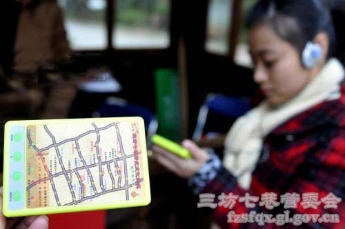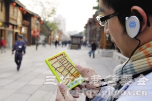这种自助导游机只有巴掌大小,可以挂在脖子上,为游客详细介绍三坊七巷中的每一处景点,包括关于景点的历史典故和名人轶事等。在自助导游机的表面显示了三坊七巷各景点的分布图,游客既可以自动接听讲解,也可以根据自己游览需要,自主选择景点讲解。