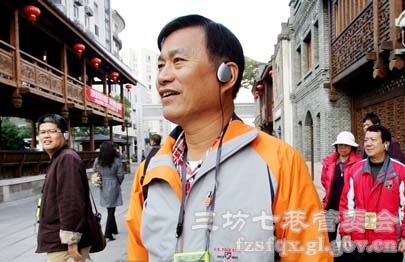 “游客,您好。您现在游览的是中国十大历史文化名街三坊七巷……”在三坊七巷,不少游客一边听着自助导游机的讲解,一边在古巷名坊间游览。