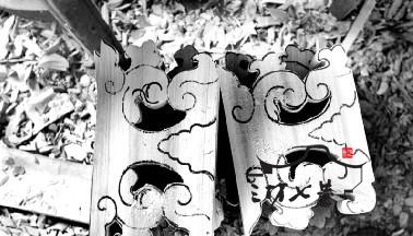 2.把老木雕按在新木雕上,用线笔按原样勾勒出花纹