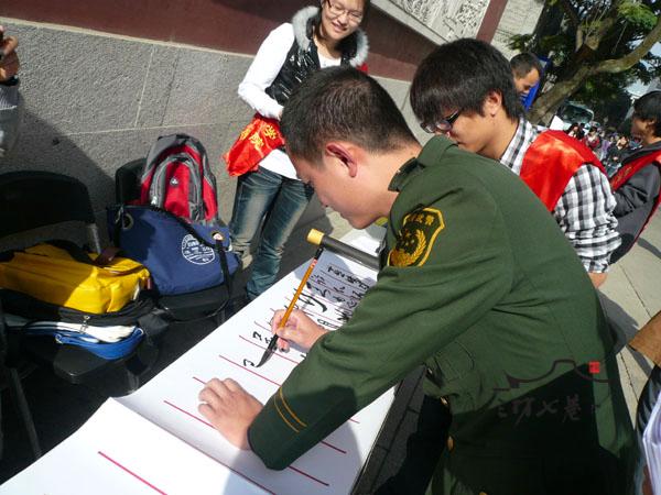 活动在朗朗的经典诵读声中展开,经典文化的声音引来了众多的游客参与其中,游客们聆听着经典的声音,认真地阅读倡议书和经典书籍,观赏着“风”、“雅”、“颂”三张海报,最后游客们还用毛笔在卷轴式样的签名横幅上留下自己的名字,参与民族文化宣传。参与活动的游客有大学教授、诗人、武警、学生等等,范围广泛、参与活动的积极性高。