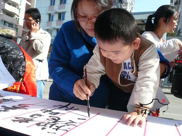 小朋友在妈妈的帮助下,用毛笔签下自己的名字