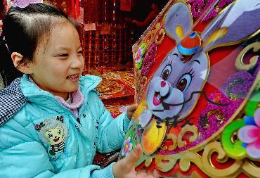 一名5岁的小女孩在福州三坊七巷选购兔年生肖卡通挂件。