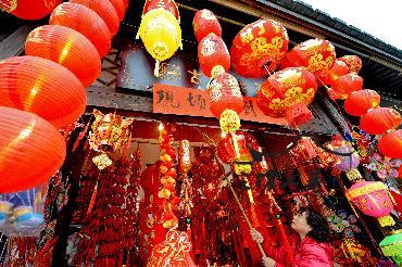 春节临近,福建市民争相购买春联、大红灯笼、兔年生肖卡通挂件等春节文化饰品,迎接新春佳节。