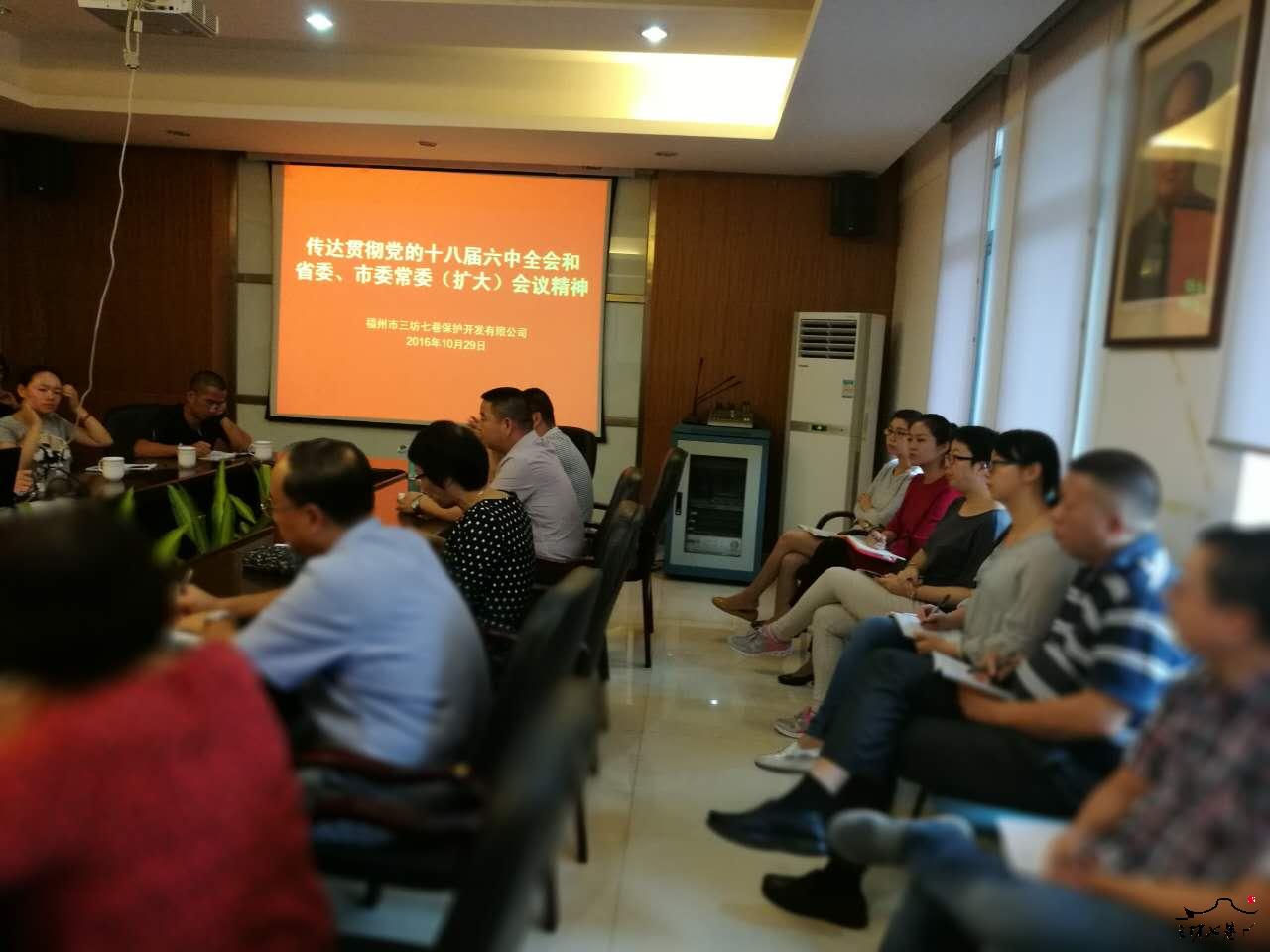 10月29日,三坊七巷保护开发有限公司党委书记、董事长谢谦华主持召开专题会议,传达党的十八届六中全会精神,研究公司贯彻落实意见。公司领导班子成员和各职能部门负责人参加了会议。本次会议应到人数31人,实到29人,请假2人。