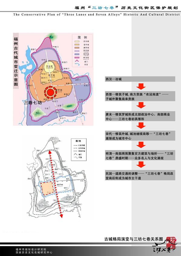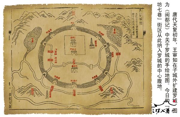 三坊七巷,国家历史文化名城福州的重要标志,是一处延续千年的城市商、住社区,位于福州城区山水格局的中心地带。遗产地范围南起安泰河,北至杨桥路(原杨桥巷),东至八一七路(南大街),西抵仓前河(今安泰河),占地面积40.03公顷。三坊七巷以南后街为南北主轴线,西侧有衣锦坊、文儒坊、光禄坊“三坊”,东侧有杨桥巷(路)、郎官巷、塔巷、黄巷、安民巷、宫巷、吉庇巷 “七巷”,其间又有曲折通幽的弄、巷沟联组成鱼骨状的传统坊巷格局。