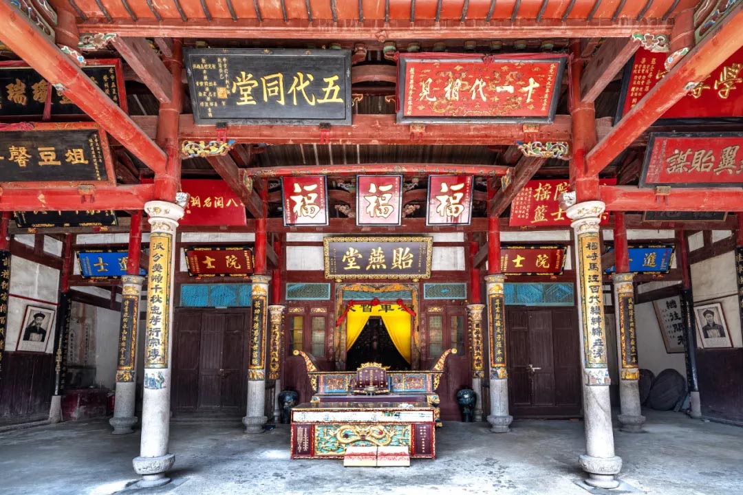 永盛梁氏宗祠占地面积693㎡,是省级文物保护单位。宗祠墙上有一对陶瓷杯拼镶的白象,高约3米,据说是梁氏族人家家户户捐献而成,情意拳拳。宗祠内保留了众多名人牌匾和名人画像。